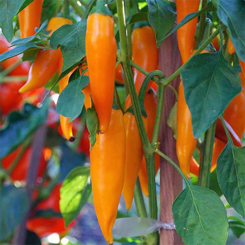 This Bulgarian heirloom produces beautiful bright orange carrot shaped hot chiles 3” long by ¾ “ wide, thin walled with a fruity, sweet taste. The prolific plants are 15”- 18” high with peppers borne in clusters close to the main stem at first green then turning florescent-orange when ripe. Excellent in salsa, ceviche and pickled.