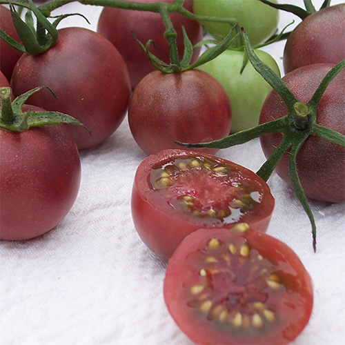 Indeterminate cherry tomato producing fruit that are irresistible with skin and flesh a combination of port wine and chestnuts and a delicious complex flavour. Very productive producing many trusses of 1” round fruit nonstop until frost and the fruit can be picked under ripe and allowed to finish ripening indoors and is still very tasty.