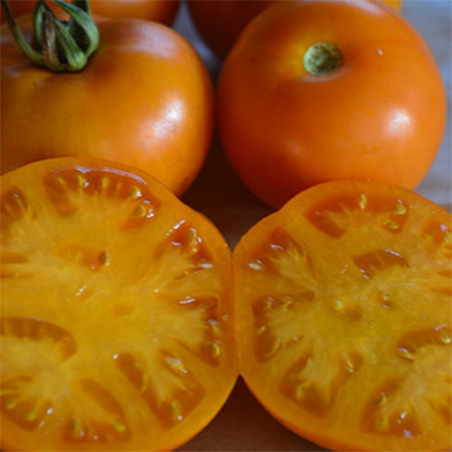 This extra early variety developed at the University of New Hampshire has an amazingly delicious flavour. The crack resistant fruits are a luscious orange both skin and flesh, smooth and blemish free. The plants are semi-determinate and ripen uniformly, need some support for the heavy yields. Great in salads and on sandwiches.