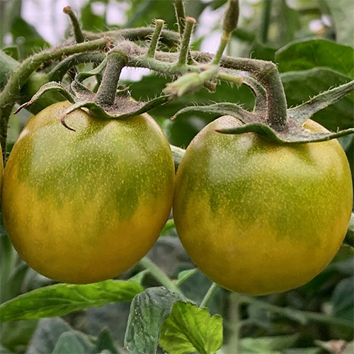 An old-fashioned determinate cherry tomato plant with distinctive yellow-green fruits born in clusters of 4-12 resembling large Muscat grapes. The green fleshed fruits are very tasty and sweet with rich juicy interiors. Easily cultivated, producing well in the field or greenhouse.
