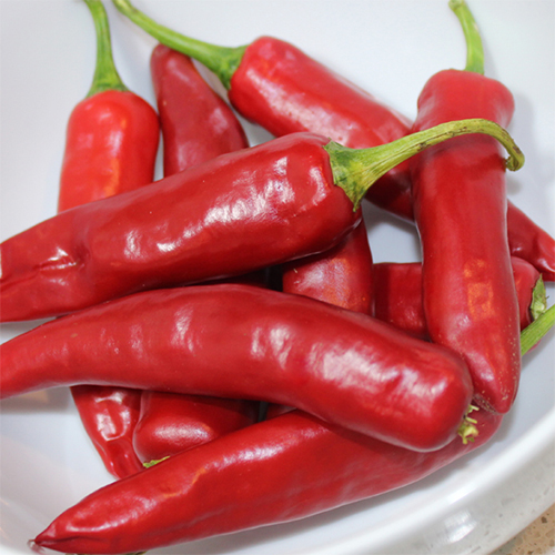 One of the most common chiles grown in Mexico. Shiny, deep orange-red with brown tones, elongated, tapering to a point and sometimes slightly curved. Thin fleshed, 4”-6” long and 1”-1.5” wide with a fruity tart flavour and a sweet tolerable heat. Great in salsas, sauces and perfect for drying in ristras.