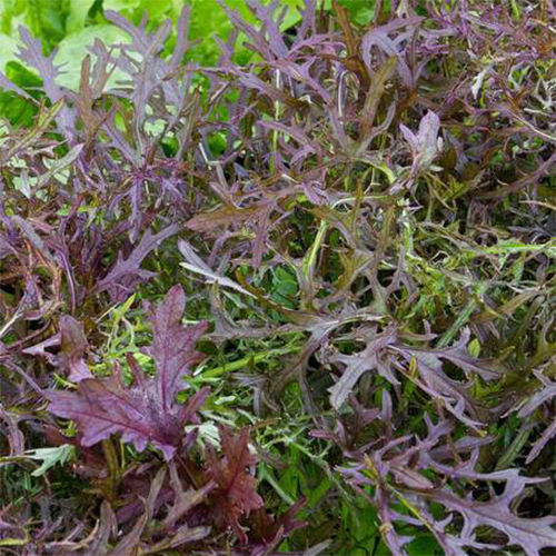 Beautiful finely serrated dark green leaves splashed with maroon. The colour ranges from dark green with red veins to dark maroon getting darker from a summer sowing and a fall harvest. The frilly leaves are sweet and tender with a slightly pungent but mild mustard flavour. An awesome addition to the salad garden.