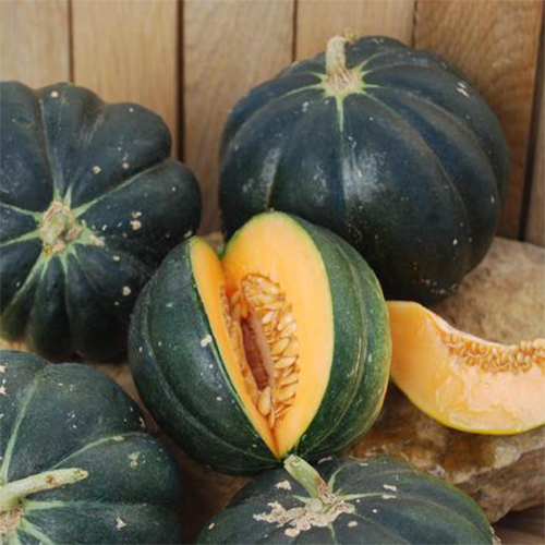 A French heirloom from before 1880. The name translates to “Early Black Rock” which reflects the very dark green, almost black colour of the skin before it ripens to a beautiful orange.The slightly flattened, smooth, ribbed fruits grow to 2 or 3 pounds with dark orange, tasty flesh.