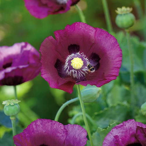 Annual: Old variety with single purple flowers containing a black splotch at the base of each petal. Easy to grow, self seeds in the garden each year. Plant in early spring, grows 2’ to 3’ tall with grayish green leaves, lobed and elliptical with serrated edges. The seed heads are beautiful in dried arrangements and the seeds are also great in baking.