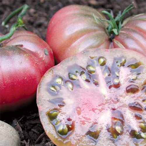 An unusual, novelty variety, very prolific, crack resistant and drought tolerant. Small ruffled purple-pink fruits blushed bronze or chocolate brown when ripe, identical to the ones figured in the 16th century herbals. These 5-6 oz. fruits have an intense flavour and are delicious eaten fresh from the garden, keep well after picking.