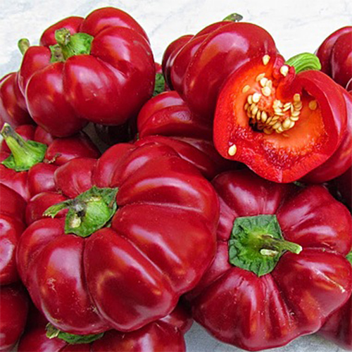 Pimento type sweet pepper ripening to dark red, thick walled with delicious, sweet succulent flesh. The best of the pimento types with beautiful ribbed, squat fruits great for stuffing, chopped in stir fry or eaten raw in salads. Can be eaten green but has the best flavour when red ripe.