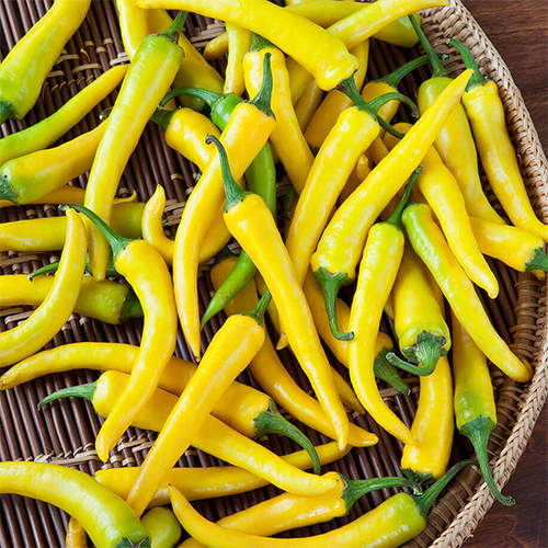 Beautiful heirloom pepper from 1870 light green turning lemon yellow then dark golden yellow orange at maturity are borne on tall 24” plants which produce an abundant quantity of these delicious fruits. Tart flavour with acidic, smoky tones and a very pungent heat. Used in sauces, soups and dried.