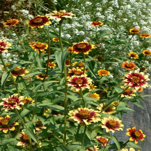 Annual: Charming addition to bedding and container plantings creating a spell binding glow of a brilliant sunset. Double and semi-double blooms 2” in bicolours of red, mahogany, gold, orange, chocolate and cream on a 2’ plant. Exotic and colourful jewels in the garden make excellent cut flowers. Also known as Mexican Zinnia was an ASA 1952 winner.